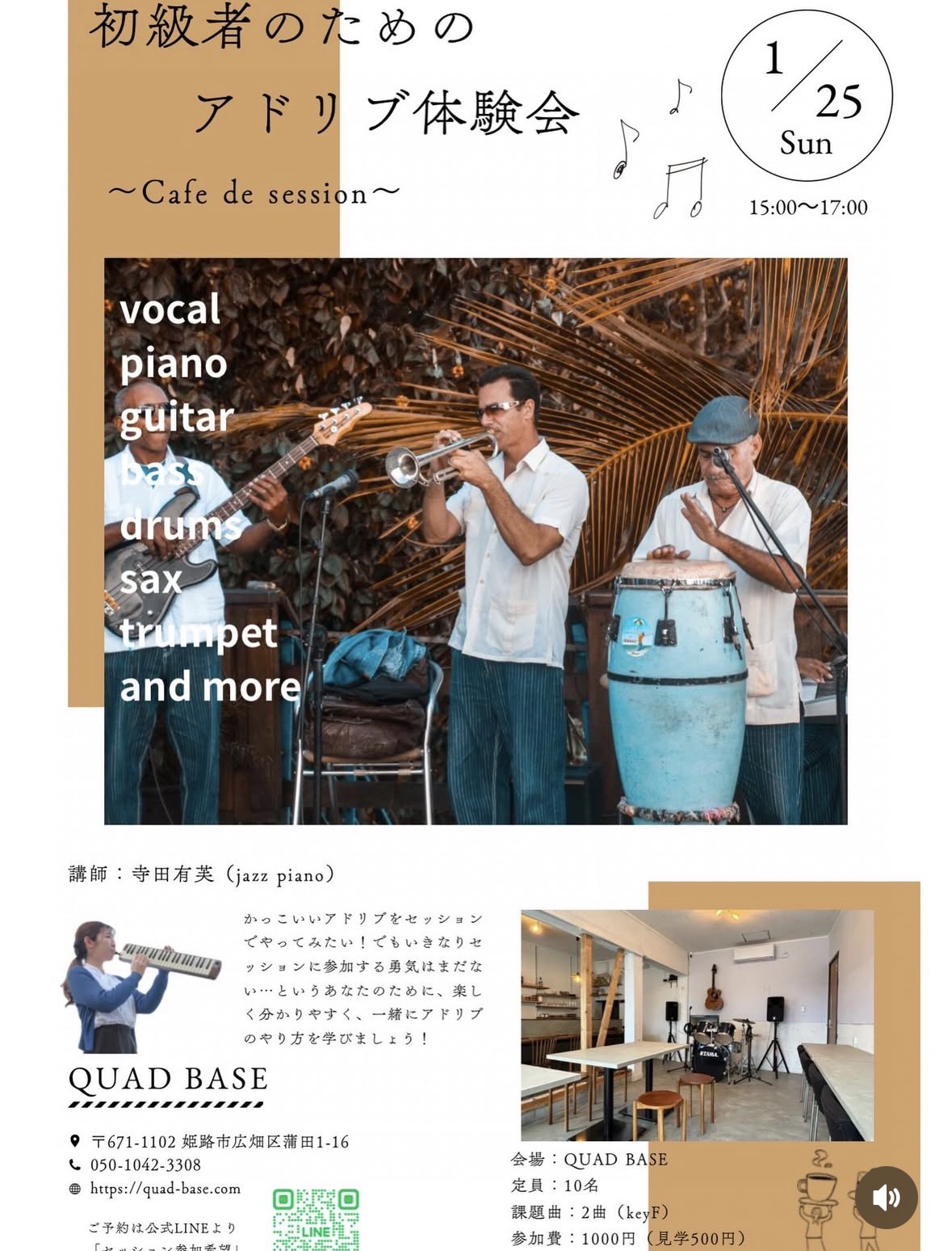 11/23(日)15:00〜17:00アドリブ体験会開催します!毎月大好評のCafeでLIVE!実は終演後共演者同士の打ち上げがいつもめちゃくちゃ盛り上がりますバンドの枠を超えてやってみたい曲を自由に...